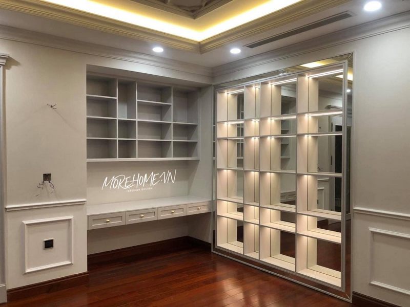 Sản phẩm kệ trang trí phòng khách bằng gỗ sơn trắng ốp kính sang trọng do Morehome thi công lắp đặt