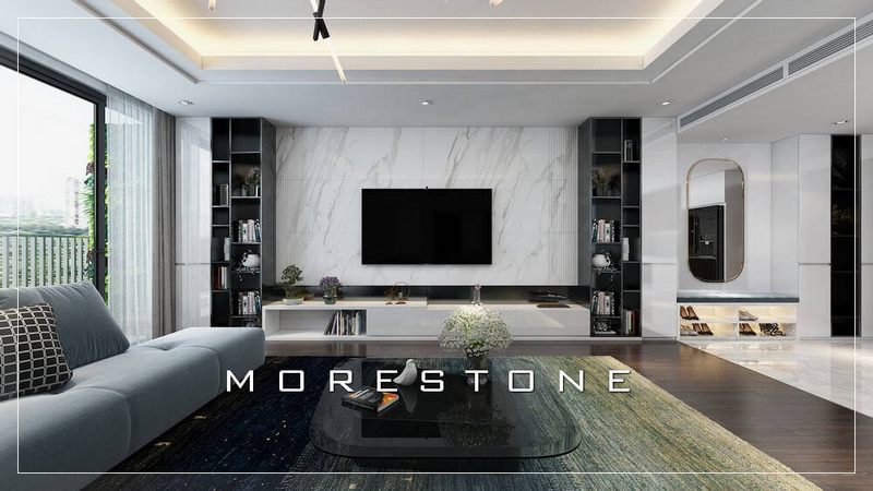 Đá ốp vách tivi đối vân tô điểm trang trí thẩm mỹ ấn tượng, sang trọng, đẳng cấp nâng tầm giá trị cho không gian