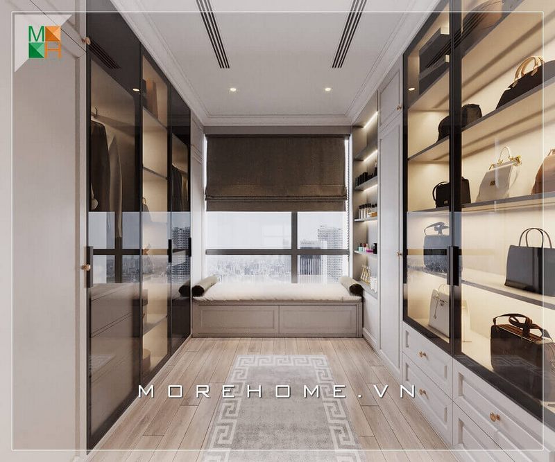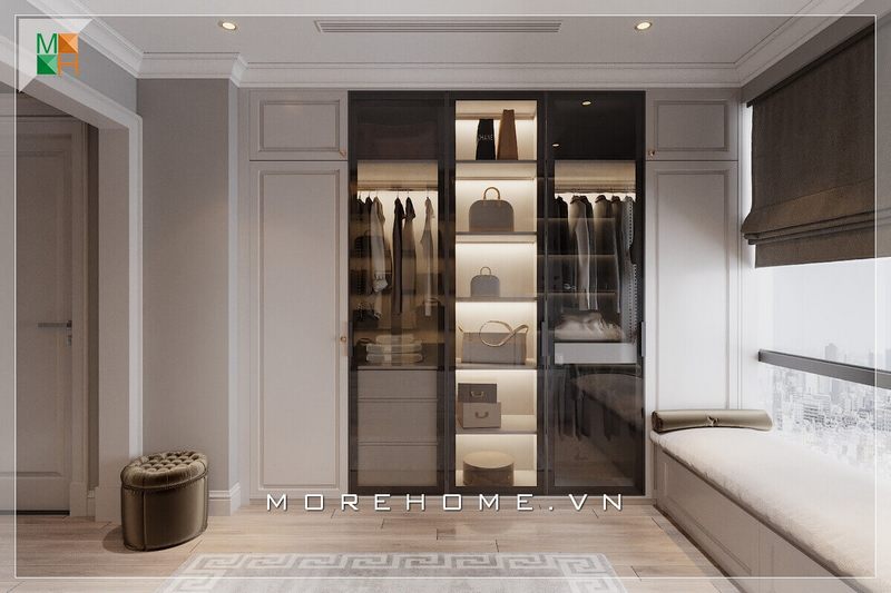 Không đơn thuần chỉ là một căn phòng để đồ đơn điệu của căn hộ chung cư, nhà phố, biệt thự mà nhà thiết kế rất sáng tạo khi thiết kế hai tủ đồ gỗ cánh kính hiện đại hai bên tường, vừa tận dụng được không gian mà còn thể hiện tính thẩm mỹ cao.