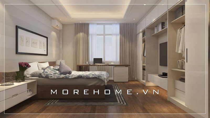 Tủ quần áo gỗ công nghiệp màu trắng ấn tượng, phần kệ ti vi được bố trí chính giữa tạo điểm nhấn ấn tượng cho cả căn phòng