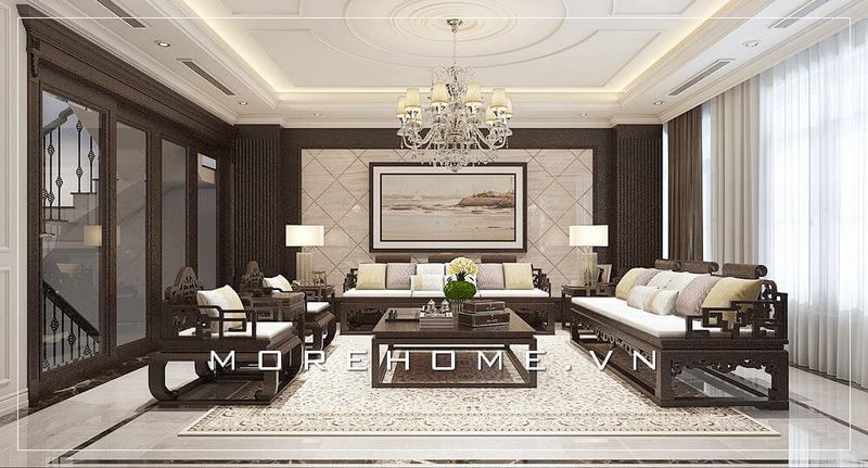 Trang trí nội thất nhà phố với sofa gỗ tự nhiên phong cách gỗ Việt đẹp và sang trọng