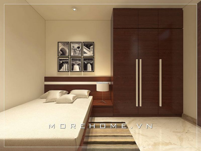 Nội thất phòng ngủ chung cư gỗ công nghiệp, chiếc giường ngủ đa năng được gia chủ lựa chọn nhằm tiết kiệm tối đa diện tích cho căn phòng ngủ nhỏ