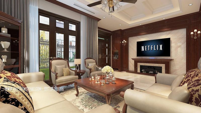 Thiết kế phòng khách nhỏ cho biệt thự theo phong cách tân cổ điển tạo không gian tiếp khách và thư giãn cho các thành viên trong gia đình