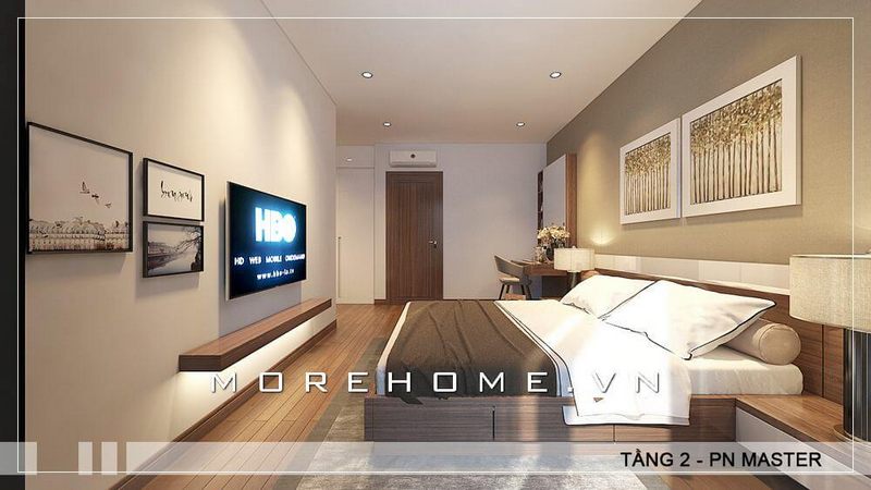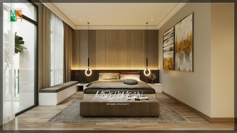 Nội thất phòng ngủ master được sắp xấp, bố trí khéo léo vừa đảm bảo tính công năng lại không làm mất đi vẻ đẹp thẩm mỹ và còn góp phần lớn giúp tiết kiệm không gian.