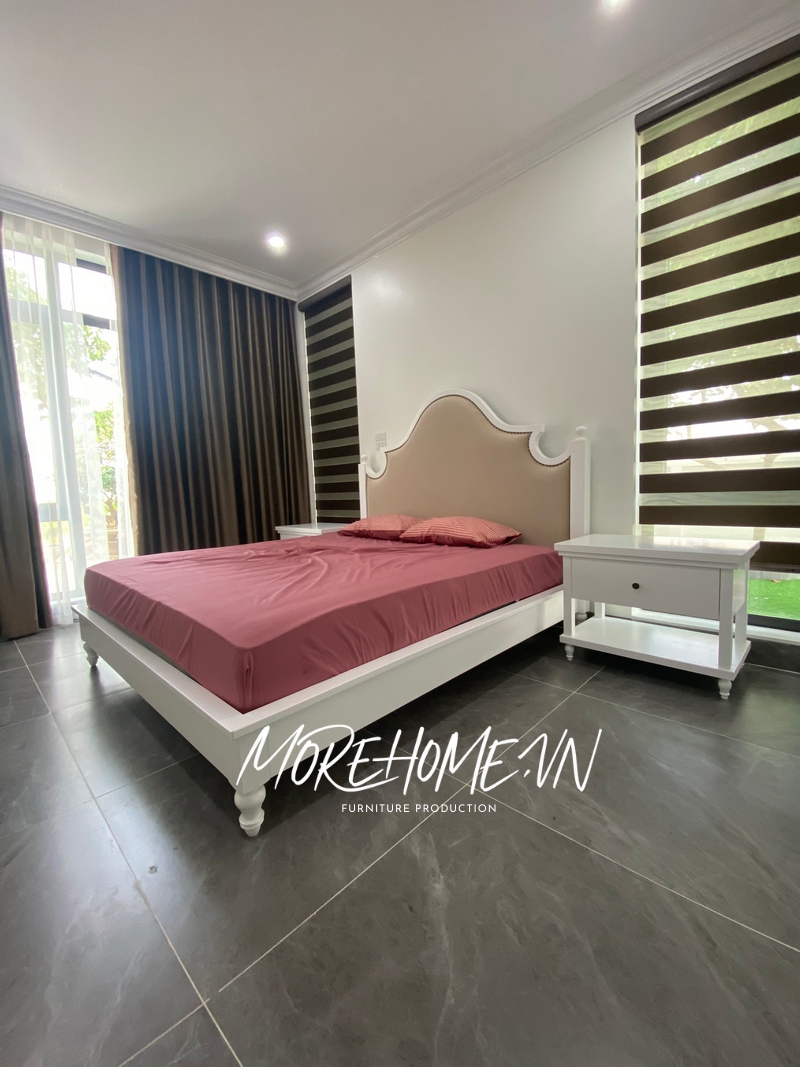 Giường ngủ gỗ tự nhiên màu trắng bọc da đầu giường tân cổ điển mang tới sự tiện nghi và thẩm mỹ cao cho không gian