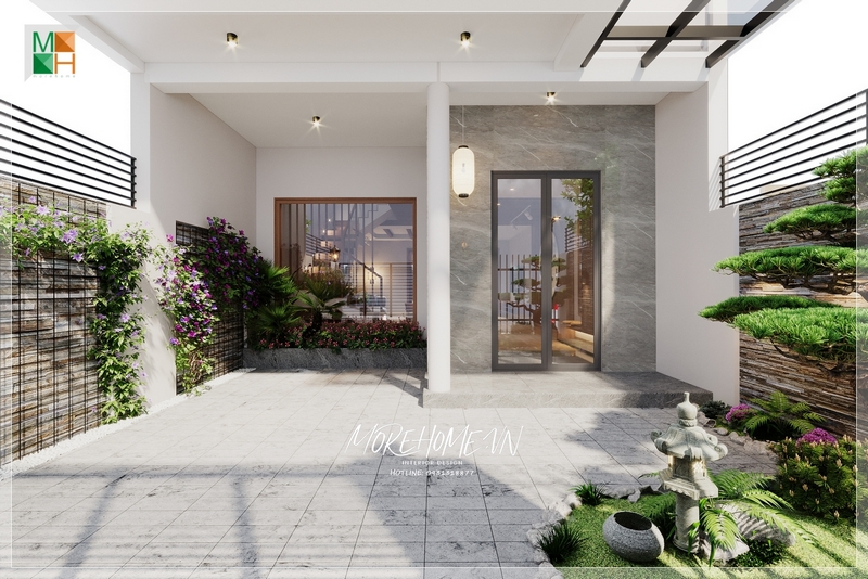 Thiết kế sân trước nhà không gian sân vườn nhỏ nhắn được tô điểm nhiều sắc màu đan xen tạo nên bầu không khí trong lành, thẩm mỹ cao.