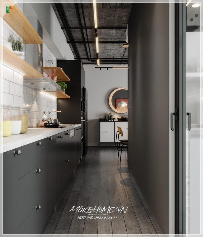 Nhìn theo chiều dài của căn phòng bếp chung cư có diện tích hẹp những với trang trí của các kiến trúc sư Morehome đã tạo nên căn phòng vẫn rất hiện đại.