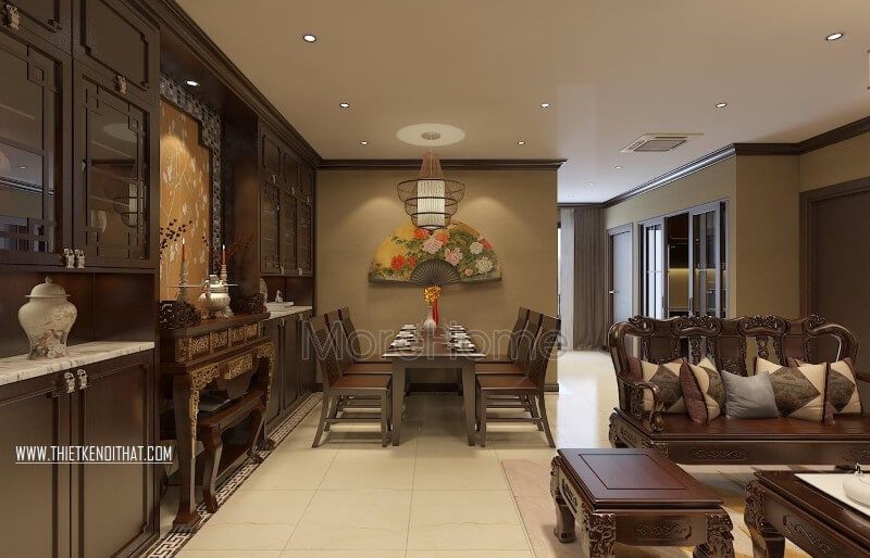 Đồ nội thất gỗ óc chó phong cách Á Đông trong một không gian phòng khách liền phòng ăn tại căn hộ chung cư, tuy tưởng tạo nên cảm giác chật hẹp nhưng nếu kết hợp khéo léo như trên đây chắc hẳn sẽ tạo nên một cảm giác vô cùng tuyệt vời.
