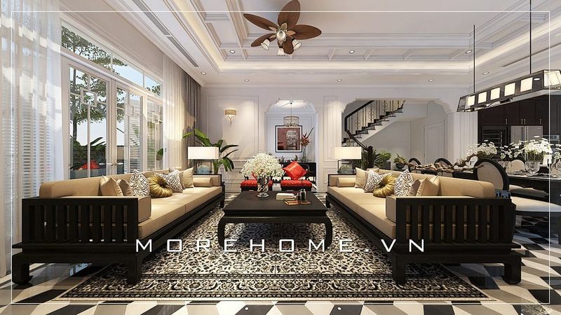 Ấn tượng với mẫu thiết kế phòng khách mang phong cách thiết kế Indochine của đội ngũ KTS của Morehome.