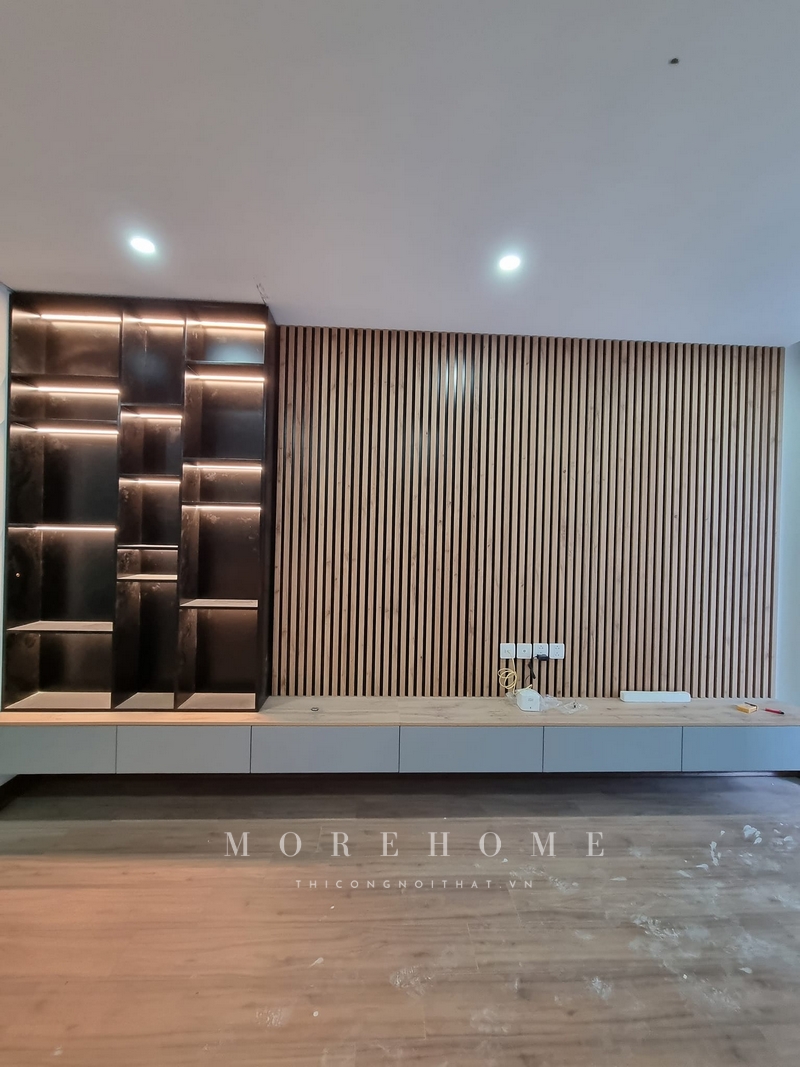 Thi công ốp vách tivi nan gỗ phòng khách sự ấn tượng. sang trọng cho không gian