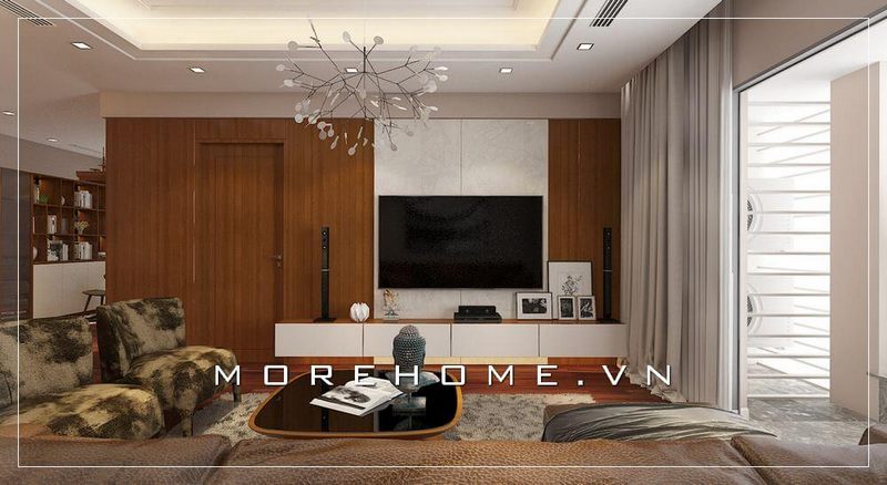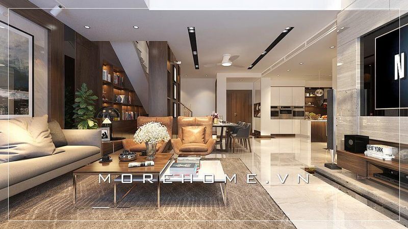 Một mẫu thiết kế phòng khách hiện đại với nội thất gỗ óc chó đẹp và sang trọng được áp dụng cho các căn hộ, nhà phố và biệt thự.