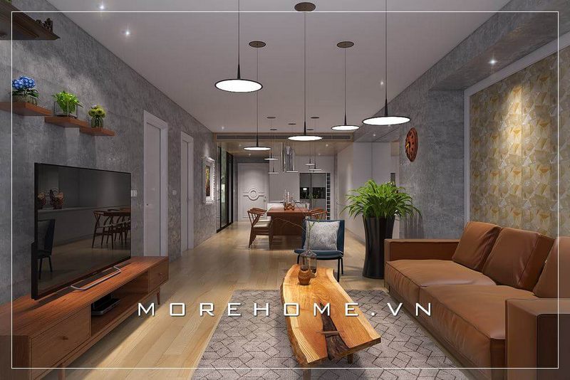 Mẫu thiết kế phòng khách chung cư cao cấp này là sự kết hợp của những bộ sofa da cao cấp, bàn trà gỗ nguyên tấm độc đáo, kệ ti vi gỗ nhỏ gọn và các phụ kiện trang trí độc đáo để tạo nên không gian sống lí tưởng.