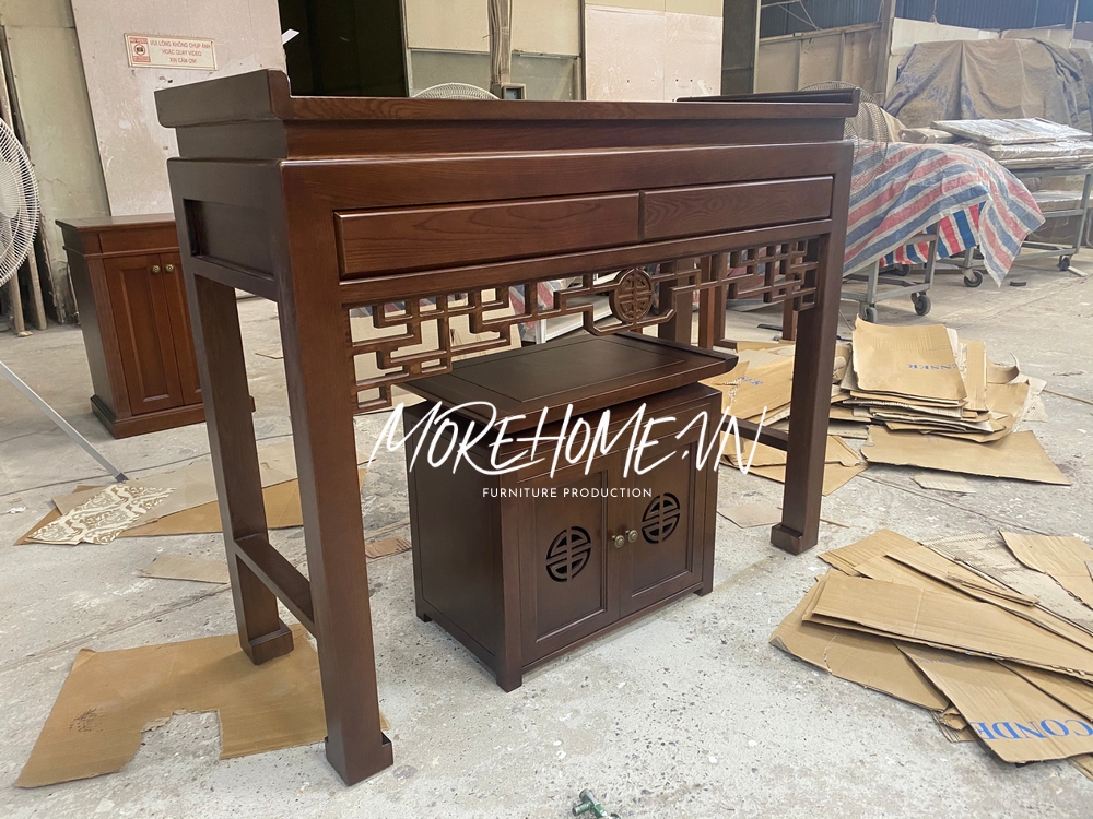 Mẫu bàn thờ gỗ cao cấp với kiểu dáng hiện đại, đường vân gỗ tinh tế được thực hiện tại xưởng gỗ nội thất MoreHome.