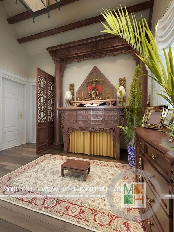 Mẫu bàn thờ gỗ tự nhiên, được chạm khắc họa tiết tỉ mỉ và mộc mạc, tạo nên không gian yên tĩnh trong chốn linh thiêng.